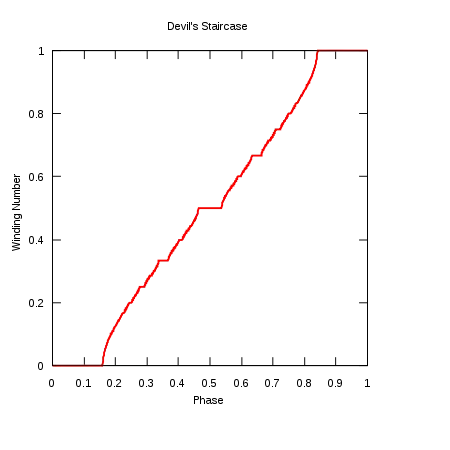 ![]() Rotation number, with black corresponding to 0, green to 1/2 and red to 1. Ω varies from 0 to 1 along the x-axis, and K varies from 0 at the bottom to 2π at the top. |