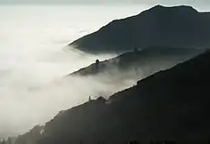 Among the notable geomorphologic points-of-interest are the Morro de Palmela, at 232 metres (761 ft), the Montes de Azeitão, that include the Serra do Louro, at 254 metres (833 ft)) and the Serra de São Francisco 257 metres (843 ft)). Parallel to the Serra do Louro, and more to the south, is the Serra de Gaiteiros, at 226 metres (741 ft), to the southwest the Serra de São Luís, at 395 metres (1,296 ft) and to the southeast the Serro do Viso at 168 metres (551 ft).[5] Along the coast lies the Serra da Arrábida, with its highest point at 499 metres (1,637 ft) (Formosinho). Over the sea and abrupt cliffs are the Serra do Risco and Píncaro, the highest point along the Portuguese coast in this area, at approximately 380 metres (1,250 ft).[5] These mountains are constituted by limestone, with frequent rocky outcroppings forming scenic cliffs.[5] Arrábida is dotted by karst cavities, that include the Gruta do Frade, known for its uniqueness, rarity, diversity and scenic beauty. From a paleontological perspective there are fossil deposits that include fragments of dinosaurs (normally sauropods), relevant to scientific investigation, commonly associated with Cape Espichel.