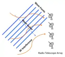 An array of radio telescopes with an incoming radio wave and RF interference