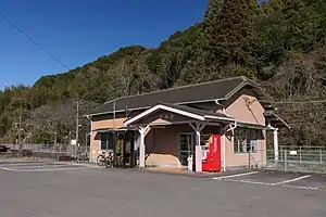 The station consists of two opposed side platforms serving two tracks. A station building linked to platform 1 serves as a waiting room. Access to platform 2 across the tracks is by means of ramps and a level crossing.[2][5] On the other side of platform 1, a siding leads to a freight platform which is used for the loading of sleepers and ballast for track maintenance.[6] The station is unstaffed but a shop sells tickets as a kan'i itaku agent.[7][8]