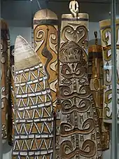 Asmat art consists of elaborate stylized wood carvings such as the bisj pole and is designed to honour ancestors. Many Asmat artifacts have been collected by the world's museums, among the most notable of which are those found in the Michael C. Rockefeller Collection at the Metropolitan Museum of Art in New York City and the Tropenmuseum in Amsterdam. Asmat art is widely collected in major Western museums despite the difficulty in visiting the remote region to collect work;[5] the "exceptionally expressive" art "caused a sensation in art-collecting circles" which led to large-scale collecting expeditions in the post-WWII era, according to art scholar and ethnologist Dirk A.M. Smidt.[6] One of the most comprehensive collections of Asmat Art can be found in the American Museum of Asmat Art at the University of St. Thomas in St. Paul, Minnesota.[7]