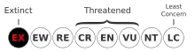 As of the 2006 classification, Aspalathus cordicarpa is classified as Extinct.[1] Alien species such as Acacia mearnsii are a severe past and present threat. Pine plantations are also a threat, as the area that Aspalathus cordicarpa is found in has been transformed into pine forestry.[1]