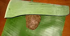 An Assamese meal is generally concluded with the chewing of Tamul (Assamese: তামোল). Pieces of Betel nut (Areca Catechu) are eaten in combination with Betel leaf (Piper betle), edible limestone and tobacco. It is a routine item after every meal.