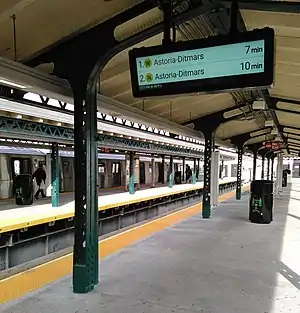 In December 1923, the Queens Chamber of Commerce petitioned the New York State Transit Commission to add the name "Astoria Avenue" to station signage. The petition was approved by the Chief of the Transit Bureau.[7] Later, enclosed waiting rooms were added to the platforms of this station and the Ditmars Boulevard station. They opened on January 17, 1925.[8]