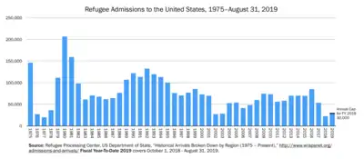 More than three million refugees from various countries around the world have been admitted to the United States since 1980.[12][2] In recent years, the number of refugees admitted by the U.S. has fluctuated due to changes in government policies. For example, under the Obama administration, the U.S. resettled 84,995 refugees in the fiscal year 2016.[13] However, during the Trump administration, the number of refugees admitted declined significantly, with only 11,814 admitted in the fiscal year 2020.[14] The Biden administration aims to increase the number of refugees accepted by setting higher caps for admissions.[15]