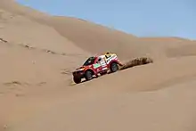 The Atacama Desert is popular with all-terrain sports enthusiasts. Various championships have taken place here, including the Lower Atacama Rally, Lower Chile Rally, Patagonia-Atacama Rally, and the latter Dakar Rally's editions. The rally was organized by the Amaury Sport Organisation and held in 2009, 2010, 2011, and 2012. The dunes of the desert are ideal rally races located in the outskirts of the city of Copiapó.[69] The 2013 Dakar 15-Day Rally started on 5 January in Lima, Peru, through Chile, Argentina and back to Chile finishing in Santiago.[70] Visitors also use the Atacama Desert sand dunes for sandboarding (Spanish: duna).