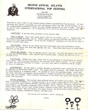 The first Atlanta International Pop Festival was a rock festival held at the Atlanta International Raceway in Hampton, Georgia, twenty miles south of Atlanta, on the July Fourth (Friday) weekend, 1969, more than a month before Woodstock.[1][2][3][4] Crowd estimates ranged from the high tens of thousands to as high as 150,000.[5] With temperatures nearing a hundred degrees, local fire departments used fire hoses to create "sprinklers" for the crowd to play in and cool off. It was a peaceful, energetic, hot and loud festival with few (if any) problems other than heat related. Concession stands were woefully inadequate. Attendees frequently stood in line for an hour to get a soft drink.
