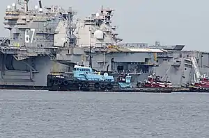 ![]() Atlantic Salvor (center) stands by as ex-USS John F. Kennedy (CV-67) is docked in Philadelphia. | |