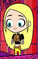 • The Tara Markov incarnation of Terra appears in Teen Titans (2003), voiced by Ashley Johnson.[42] This version is more sympathetic and tragic than her comics counterpart and initially displays little control over her powers, the latter trait being a source of shame for her. While on the run due to her powers, she encounters the Teen Titans, during which she confides in Beast Boy her fear of losing control of her powers and he develops a crush on her, and Slade, who claims to know everything about her and offers to help her. Agreeing with Slade, she temporarily leaves the Titans to study under him before returning to serve as a double agent and dates Beast Boy until he breaks up with her when she reveals her true allegiance.[43] She helps Slade take over Jump City and seemingly kills the Titans, but develops second thoughts. After Slade betrays her, she overcomes his control, kills him, and sacrifices herself to save Jump City, turning to stone in the process.[44] Sometime later, Beast Boy discovers Terra disappeared and encounters a girl resembling her with no powers or recollection of what happened.[45]