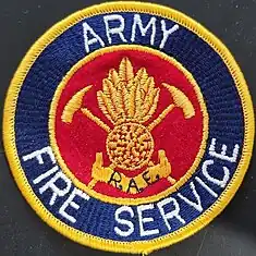 In more modern times the first known example of a colour patch worn by Australian Army personnel was that of the Australian Army Fire Service (AFS). The patch was originally designed and worn by members of the Enoggera Fire Station (c. 1980) and consisted of a blue roundel ring around a red circle in the centre. The words "Army Fire Service" emblazoned in the blue roundel and an image of the Royal Australian Engineer 'bomb' insignia in front of two crossed fire axes in centre circle. The badge was worn on the right sleeve, and whilst initially unofficial, it was quickly adopted by all other units of the Australian Army Fire Service, including being used as insignia on the doors of AFS vehicles. Over time the patch was modified several times, with the image below depicting the second generation, where the blue outer edge stitching was changed to gold.