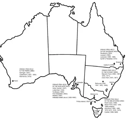 While an event called the Australian Grand Prix was staged in 1927 at the grass surface Goulburn Racecourse held as a series of sprints,[4] it is generally accepted that the Australian Grand Prix began as the 100 Miles Road Race held at the Phillip Island road circuit in 1928.[5] The inaugural race was won by Arthur Waite in what was effectively an entry supported by the Austin Motor Company, a modified Austin 7. For eight years, races, first called the Australian Grand Prix in 1929, continued on the rectangular dirt road circuit. Bugattis dominated the results, taking four consecutive wins from 1929 to 1932. The last Phillip Island race was in 1935 and the title lapsed for three years. An AGP style event was held on Boxing Day, 1936 at the South Australian town of Victor Harbor for a centennial South Australian Grand Prix[6] before the Australian Grand Prix title was revived in 1938 for the grand opening of what would become one of the world's most famous race tracks, Mount Panorama just outside the semi-rural town of Bathurst. Only just completed, with a tar seal for the circuit still a year away, the race was won by Englishman Peter Whitehead racing a new voiturette ERA B-Type that was just too fast for the locally developed machinery.[7] One more race was held, at the Lobethal Circuit near the South Australian town of Lobethal in 1939, before the country was plunged into World War II.