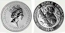 The obverse depicts the Queen of Australia, Elizabeth II, and the reverse contains an image of a koala.[5] The initials JB of the reverse face designer James Brown are present on most coins. Other designers of the coin include Raphael Maklouf (1990, 1991, 1996, 1998),[5][6][7] Miranda Cornell (1998)[8] and Darryl Bellotti (2010).[1] The annual series contain coins weighing from 1/20 ounce to 1 kilogram.[9]