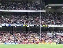 Clubs began touring the colonies in the late 1870s, and in 1879 the first intercolonial match took place in Melbourne between Victoria and South Australia.[45] In order to standardise the sport across Australia, delegates representing the football associations of South Australia, Tasmania, Victoria and Queensland met in 1883 and updated the code.[43] New rules such as holding the ball led to a "golden era" of fast, long-kicking and high-marking football in the 1880s, a time which also saw players such as George Coulthard achieve superstardom, as well as the rise of professionalism, particularly in Victoria and Western Australia, where the code took hold during a series of gold rushes.[46] Likewise, when New Zealand experienced a gold rush, the sport arrived with a rapid influx of Australian miners. Now known as Australian rules or Australasian rules, the sport became the first football code to develop mass spectator appeal,[45] attracting world record attendances for sports viewing and gaining a reputation as "the people's game".[46]