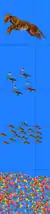 The wall-eyed depth map example autostereogram to the right encodes 3 planes across the x-axis. The background plane is on the left side of the picture. The highest plane is shown on the right side of the picture. There is a narrow middle plane in the middle of the x-axis. Starting with a background plane where icons are spaced at 140 pixels, one can raise a particular icon by shifting it a certain number of pixels to the left. For instance, the middle plane is created by shifting an icon 10 pixels to the left, effectively creating a spacing consisting of 130 pixels. The brain does not rely on intelligible icons which represent objects or concepts. In this autostereogram, patterns become smaller and smaller down the y-axis, until they look like random dots. The brain is still able to match these random dot patterns.