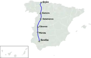 The Autovía A-66 is a major highway in western Spain, part of the European route E803. The road is an upgrade of the N-630 which was undertaken section by section. The route roughly corresponds to the ancient Roman 'Silver Route' connecting the cities of Mérida and Astorga.