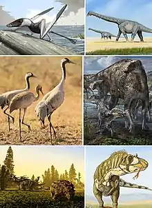 Avemetatarsalia (meaning "bird metatarsals") is a clade of diapsid reptiles containing all archosaurs more closely related to birds than to crocodilians.[2] The two most successful groups of avemetatarsalians were the dinosaurs and pterosaurs. Dinosaurs were the largest terrestrial animals for much of the Mesozoic Era, and one group of small feathered dinosaurs (Aves, i.e. birds) has survived up to the present day. Pterosaurs were the first flying vertebrates and persisted through the Mesozoic before dying out at the Cretaceous-Paleogene (K-Pg) extinction event. Both dinosaurs and pterosaurs appeared in the Triassic Period, shortly after avemetatarsalians as a whole.[2][3] The name Avemetatarsalia was first established by British palaeontologist Michael Benton in 1999. An alternate name is Pan-Aves, or "all birds", in reference to its definition containing all animals, living or extinct, which are more closely related to birds than to crocodilians.[4]