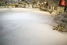 The interior of a barn showing infected birds who have been killed by suffocation with foam
