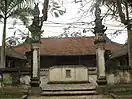 The Tho Ha Communal House, located in Tho Ha village, Việt Yên district, was built during the rule of King Lê Hy Tong. It was built in the form of the Chinese character cong and it is known as "the praise-giving house". It is built over a raised ground and is 27 metres (89 ft) long and 16 metres (52 ft) wide and approached from all sides by three grey stone steps. The roofs of the Communal House has an ancient crescent-shaped tiled roof that curves up like a scimitar sword blade. At the four corners, decorated with purple-burned glazed terra-cotta creatures of lion cubs are depicted. It has 22 levels engraved with dragons, clouds, and lion cubs. The communal house has 7 rooms built on 48 ironwood pillars. The roof frame is decorated with engravings of "ladies in long dresses wearing their hair in buns or turbans, riding phoenixes and dragons or dancing over the floating clouds". Polished blue stones decorate the floor of the house. It has a wooden entrance engraved and painted in gold which gives it an ancient ambience. There is also an inscription on a stone, which says that the Tho Ha Communal House was built out of contributions from local villagers.[8]