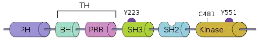 BTK contains five different protein interaction domains. These domains include an amino terminal pleckstrin homology (PH) domain, a proline-rich TEC homology (TH) domain, SRC homology (SH) domains SH2 and SH3, as well as a kinase domain with enzymatic activity.[5]