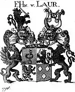 At the beginning of the 13th century, when they acquired the Blagaj Castle in central Croatia, they also adopted the name of Blagay at the same time, after the Blagay estate they possessed. Due to wish of connecting themselves to the oldest existing noble families of Europe, without any written proof, the family started to claim kinship to the House of Orsini, family that produced many Popes and Cardinals. As an homage to the that special connection, they added the name Ursini in front of their already existing name of Blagay and became Ursini von Blagay.[6] After the marriage of Count Franz Ursini von Blagay (d. 1576) to Maria Magdalena, Baroness von Lamberg (1540-1580), they also became owners of Boštanj castle, which remained in their possession until the end of the 19th century. The Counts Ursini von Blagay, cadet branch of the Babonić family, resettled to neighboring Carniola in the late 16th century after the loss of their possessions in the Una Valley to the Ottomans and automatically became part of the Austrian nobility. In the 19th century, by virtue of marriage to the Billichgrätz family, they also became owners of Polhov Gradec Castle. Family members also had a prominent role in the Slovenian national revival in the 19th century. With the death of Count Ludwig Ursini von Balagy (1830-1897), the family died out in male line in 1897. After his death, the descendants of his sister, Baroness Mathilde von Lauer (1833-1922), who outlived him for another 25 years, as designated heirs and next of kin, adopted the family name and incorporated into their own, being Barons Lauer-Ursini von Blagay.[7][8][9]
