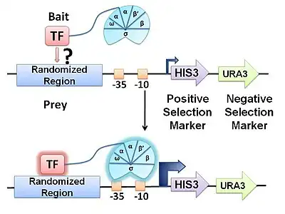 The bacterial one-hybrid (B1H) system is a method for identifying the sequence-specific target site of a DNA-binding domain. In this system, a given transcription factor (TF) is expressed as a fusion to a subunit of RNA polymerase. In parallel, a library of randomized oligonucleotides representing potential TF target sequences are cloned into a separate vector containing the selectable genes HIS3 and URA3. If the DNA-binding domain (bait) binds a potential DNA target site (prey) in vivo, it will recruit RNA polymerase to the promoter and activate transcription of the reporter genes in that clone. The two reporter genes, HIS3 and URA3, allow for positive and negative selections, respectively. At the end of the process, positive clones are sequenced and examined with motif-finding tools in order to resolve the favoured DNA target sequence.[1]