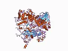 The assembly of a macromolecular structure proceeds via a specific pathway of ordered events and involves conformational changes in the proteins as they join the assembly. The assembly process is aided by scaffolding proteins, which act as chaperones. In bacteriophage, scaffolding proteins B and D are responsible for procapsid formation. 240 copies of protein D form the external scaffold, while 60 copies of protein B form the internal scaffold.[1] The role of scaffolding protein D is in the production of viral single-stranded RNA.