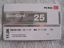 BahnCard (German Bahn – Rail) is a discount subscription programme offered by Deutsche Bahn (DB), the German national railway company. Unlike airline loyalty programs, but similarly to the UK Railcard, the BahnCard entitles the passenger to a discount price and must be purchased prior to travel. The BahnCard is offered in a non-business and a business version called BahnCard Business. Non-business BahnCard contracts are automatically renewed each year, unless they are cancelled with sufficient notice. Three variants of BahnCard are sold by Deutsche Bahn: The BahnCard 25, the BahnCard 50, and the BahnCard 100. The first two variants allow passengers to get 25% and 50% discount respectively on standard long-distance rail fares, while the Mobility BahnCard 100 is a type of annual ticket that allows free unlimited travel on most of the German railway network for a fixed price.[1] The (non-business) BahnCard 25/50 are valid for one year and can only be purchased by subscription. If they are not canceled no later than six weeks before the expiry date, their term is automatically extended by another year.[1] BahnCard Business 25/50 are also valid for one year but require no cancellation.[2] Unlike the personal BahnCard, BahnCard Business can be combined with the discount that is granted to large-volume business customers.[3][2]
