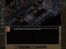 The player interacts with characters and objects by clicking on them.[13] Clicking on the ground causes the player's selected characters to move.[14] The gameplay, though in real-time, can be paused, whereupon commands may be issued to controllable characters, who will attempt to execute them when the game is unpaused.[15] The game can also be set to pause automatically at certain times.[8] Dialogue is started by NPCs at certain scripted times, or by the player's clicking on NPCs who are not immediately hostile. When speaking to an NPC, the player must often choose what to say from a list of responses. The dialogue may lead to quests or important information. When the player clicks on a hostile being, the currently selected characters will advance to attack it.[13] Information about characters, creatures, items, and buildings in the game environment is shown on a tool tip, which appears when the mouse pointer is held over game elements.[16]