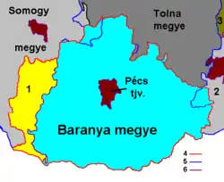 Baranya (Hungarian: Baranya, Croatian: Baranja, Serbian: Барања / Baranja, German: Branau) was an administrative county (comitatus) of the Kingdom of Hungary. Its territory is now divided between present-day Baranya County of Hungary and Osijek-Baranja County of Croatia. The capital of the county was Pécs.