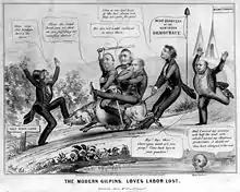 The Barnburners were the radical faction. The term barnburner was derived from a folktale about a Dutch farmer who burned down his own barn in order to get rid of a rat infestation.[1] In this case it was applied to men who were thought to be willing to destroy all banks and corporations, in order to root out their abuses.[2]