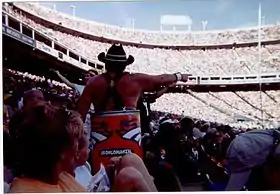 Barrel Man, real name Tim McKernan (September 5, 1940 – December 5, 2009),[1] was a superfan of the Denver Broncos. In all types of weather for 30 years, he attended every home game at both Mile High Stadium and INVESCO Field at Mile High wearing nothing but an orange barrel that covered his torso and a cowboy hat and boots. His costume was reminiscent of rodeo clowns (or barrelmen) who serve as a distraction to animals in the rodeo arena in order to protect riders who have been thrown and of the stereotype of the miner who lost his stake and had nothing left to wear but a barrel. He was the first Broncos fan inducted into the VISA Hall of Fans[2][3] at the Pro Football Hall of Fame.[4][5]