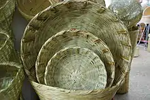 The basketry of the Center of the country covers the states of Jalisco, Michoacan, Guanajuato, Aguascalientes, San Luis Potosí, Querétaro, Hidalgo, State of Mexico and Morelos. The basketry tradition here is mixed, mostly of European techniques and designs but indigenous forms are still produced.[1] The most common materials include rushes and reeds, especially in the State of Mexico, Morelos and Hidalgo, around the shores of the Lerma and Tultepec rivers, Lake Cuitzeo, Lake Patzcuaro and Lake Chapala.[1] The working of willow branches to make baskets is also common.[4] Palm fronds are worked in warmer climates from Matehuala, San Luis Potosi, south to the state of Morelos, mostly to make petates, fanes and tenates. In the Tierra Caliente of Michoacán, palm fronds are produced in abundance and are used to create sombreros, tenates, fans, brooms and capotes (rain capes).[1]