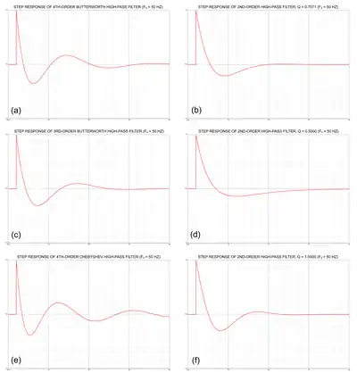 Compared to closed-box loudspeakers, bass reflex cabinets have poorer transient response, resulting in longer decay times associated with the bass notes.[4] Some example step responses for various high-pass filter functions are shown in the relevant figure, where each filter has an identical −3 dB cut-off frequency of 50 Hz. In that figure, (a) represents the step response of a conventional B4 vented box alignment, while (b) represents the step response of a B2 closed-box alignment with Q = 0.7071. The transient response of a vented-box loudspeaker can be improved by choosing a QB3 alignment similar to (c), which results in a more well damped transient response than that produced by the B4 alignment. However, a C4 vented-box alignment similar to (e) results in a less well damped transient response.