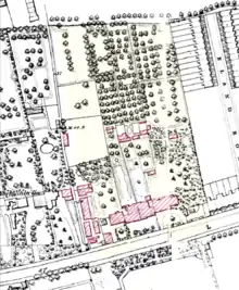 Although initial consideration was given to the proposed hall in 1888, it was not until 1891 that the vestry decided to act on their ambitions and to allocate a budget of £42,000 to the project. Eight sites were considered, all south of the main east-west railway lines that divide the parish. The vestry decided upon the purchase of Elm House, a villa with a small wooded estate on Lavender Hill, previously the home of Jane Senior, and which was close to their Lavender Hill Library building, as the site for the new hall.[8][9]