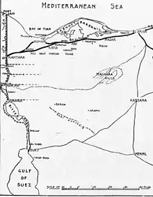 At the beginning of the First World War the Egyptian police controlling the Sinai Peninsula had withdrawn, leaving the area largely unprotected. In February 1915 a German and Ottoman force unsuccessfully attacked the Suez Canal.[2] Minor Ottoman and Bedouin forces operating across the Sinai continued to threaten the canal from March through the Gallipoli campaign until June, when they practically ceased until the autumn.[3] Meanwhile, the German and Ottoman Empires supported an uprising by the Senussi (a political-religious group) on the western frontier of Egypt which began in November 1915.[4]