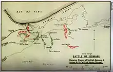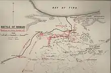 The 52nd (Lowland) Division developed a strong defensive position at Romani which had its left flank on the Mediterranean Sea, here a series of redoubts were built running southwards from Mahamdiyah along the line of high sand hills about 7 miles (11 km) to a dune known as Katib Gannit 100 feet (30 m) high. This line of sand hills, which were high enough to see Katia oasis from, marked the eastern edge of an area of very soft and shifting sand beyond which were lower dunes and harder sand where movement by both infantry and mounted forces was considerably easier. Between the shore at the western end of the Bardawil Lagoon and Katib Gannit (the principal tactical point on the eastern slopes of the Romani heights), the infantry constructed a line of 12 redoubts about 750 yards (690 m) apart, with a second series of redoubts covering the Romani railway station and the right of the defensive position which curved like a hook westward, then northward. A total of 18 redoubts were constructed, which when fully garrisoned held from 40 to 170 rifles each, with Lewis guns and an average of two Vickers machine guns allotted to each position; they were well wired on the right side of each of the positions, although there was no wire between the redoubts.[46] This defensive line was supported by artillery.[47][48]