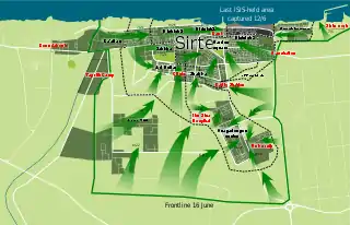On 18 August, ISIL fighters from outside the city attacked GNA fighters at a rallying area and a checkpoint, killing at least 10 GNA fighters and wounding 20.[90] Another attack by three IS suicide-bombers was prevented and the attackers killed.[91] Between 21 and 22 August, pro-GNA militias captured the Ribat mosque, the city's biggest and main mosque,[92] as well as the internal security building that was used as an IS prison, a courthouse, the Al-Naga district and Dubai Street.[93]