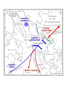 The Russian coastal fleet had meanwhile approached from the east and was probing its way through the Swedish blockade under fire. Advantage shifted from the defenders to the attackers at 16:00 when the right wing of the Russian coastal fleet led by Giolio Litta penetrated the unblockaded narrow passage between Majasaari (Koiromsari) and Tiutine. The Russian attack forced Swedish ships guarding the blockade to withdraw allowing the Russians to clear remaining blockade obstacles.[4]