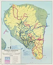 Tarakan's value to the Japanese evaporated with the rapid advance of Allied forces into the area during 1944. The last Japanese oil tanker left Tarakan in July 1944, and heavy Allied air raids later in the year destroyed the island's oil production and storage facilities.[7] Hundreds of Indonesian civilians may have also been killed by these raids.[8] The Allies also laid mines near Tarakan, which, combined with patrols by air and naval units, prevented Japanese merchant vessels and transports from docking at the island.[7]