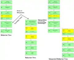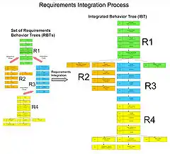 • Integrated behavior trees: Because a set of requirements imply the integrated behavior of a system, all the individual requirement behavior trees can be composed to construct an integrated behavior tree (IBT) that provides a single holistic view of the emergent integrated behavior of the system. This enables the building of the integrated behavior of a system out of its requirements.[8] An analogy to help describe this process is the transition from a randomly arranged set of jigsaw puzzle pieces to putting each of the pieces in its appropriate place. When we do this, we see each piece of information in its intended context and we see the pieces of information as a whole and the emergent properties of the whole.