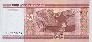 "On 1 September 2010, new rules of Belarusian orthography came into force. According to the old rules, the correct spelling of the word “fifty” in Belarusian was “пяцьдзесят,” (pyats'dzesyat) but under the new rules, it should be spelled “пяцьдзясят,” (pyats'dzyasyat) the difference being that the seventh character was the Cyrillic letter YE but is now the Cyrillic letter YA. As a result of these new rules, the existing 50 and 50,000 ruble notes dated 2000 now technically contain errors where the denominations are spelled out on the notes. On 29 December 2010, the National Bank of Belarus introduced new 50- and 50,000-ruble banknotes to bring the inscriptions on the notes into compliance with the new rules of Belarusian spelling and punctuation. The images, colors, and sizes of the notes remain consistent with the preceding issues of the same denominations dated 2000. The modified 50 ruble notes also no longer has a security thread, and the modified 50,000 ruble notes have replaced the solid security thread for a 2mm-wide windowed security thread."[12]