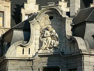 A small annex dating from 1741, called the Mammelokker, served as the entrance and guard's quarters of the city jail that occupied part of the old cloth hall from 1742 to 1902. The name refers to the sculpture of Roman Charity poised high above the front doorway. It depicts the Roman legend regarding a prisoner called Cimon. Cimon was sentenced to death by starvation, but survived and ultimately gained his freedom thanks to his daughter Pero, a wet nurse who secretly breastfed him during her visits. Her act of selflessness impressed officials and won her father's release. The term 'mammelokker' translates as 'breast sucker'.[9]