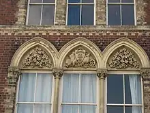 - Grimsby Town Hall 1861–1863. Designed with John Giles of London. The work was superintended by James Fowler of Louth. The Doughty Museum and Municipal Offices formed flanking pavilions to the Town Hall. Yellow brick with yellow stone with Italianate details. Set with roundel portraits of the founding figures in Grimsby history; Archbishop Whitgift (born in the town's Old Market Place), Gervase Holles, (a Mayor in 1640, a Royalist, and a local historian), Edward III (who granted land to the town's freemen), and three more recent figures, the Earl of Yarborough, Queen Victoria and Prince Albert.[30] Bellamy also used roundels as a decorative feature on Ipswich Town Hall.