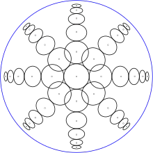 Circles (the set of all points in a plane that are at a given distance from a given point, its center) in the model become ellipses increasingly flattened as they are nearer to the edge. Also angles in the Klein disk model are deformed.
