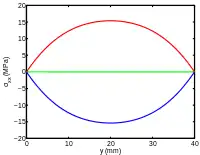 Stress ()Displacement and stresses along for a rectangular plate with mm, mm, mm, GPa, and under a load kPa. The red line represents the bottom of the plate, the green line the middle, and the blue line the top of the plate.