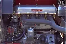 The 3.0 L (2,996 cc or 183 cu in) straight-4 engine was designed by ex-Royal Flying Corps engineer Clive Gallop[3] and was technically very advanced for its time. It was one of the first production car engines with 4 valves per cylinder, dry-sump lubrication and an overhead camshaft. The four valve SOHC Hemi design, with a bevel-geared shaft drive for the camshaft, was based on the pre-World War I 1914 Mercedes Daimler M93654 racing engine.[4] Just before the outbreak of the war Mercedes had placed one of the winning Grand Prix cars in their London showroom in Long Acre. At the suggestion of W.O. Bentley, then being commissioned in the Royal Naval Air Service, the vehicle was confiscated in 1915 by the British army, dismantled at Rolls-Royce and subjected to scrutiny.[5][6][7] A notable difference to both the Mercedes and the aero engines was the cast-iron monobloc design, and the fully Aluminium enclosed camshaft, which greatly contributed to its durability. But having the valve-head and block in one-piece made for a complicated and labour-intensive casting and machining.[8] This was a feature shared during that time by the Bugattis which the car was later to compete with. The engine was also among the first with two spark plugs per cylinder, pent-roof combustion chambers, and twin carburettors. It was extremely undersquare, optimized for low-end torque, with a bore of 80 mm (3.1 in) and a stroke of 149 mm (5.9 in).