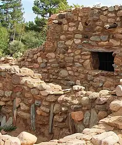 All walled architecture at Besh-Ba-Gowah consists of unshaped, large to moderate-sized, granite cobble masonry laid with a clay mortar. Evidence suggests interior room walls were commonly plastered with this mortar or a more calcareous mixture resulting in white-colored finished walls. There are some indications that at least selected exterior wall surfaces were also plastered with the original clay mortar. Often the basal masonry course consisted of upright vertical slabs, presently considered characteristic of Salado masonry architecture.[1]