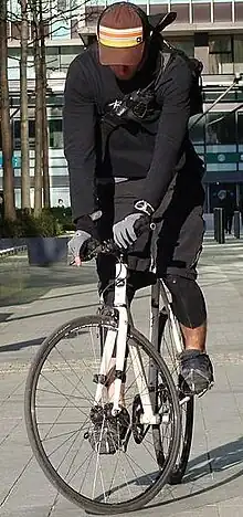 A bike is also an example of an inverted pendulum. Just as a broomstick is more easily balanced in the hand than a pencil, a tall bike (with a high center of mass) can be easier to balance when ridden than a low one because the tall bike's lean rate (rate at which its angle of lean increases as it begins to fall over) will be slower.[38] However, a rider can have the opposite impression of a bike when it is stationary. A top-heavy bike can require more effort to keep upright, when stopped in traffic for example, than a bike which is just as tall but with a lower center of mass. This is an example of a vertical second-class lever. A small force at the end of the lever, the seat or handlebars at the top of the bike, more easily moves a large mass if the mass is closer to the fulcrum, where the tires touch the ground. This is why touring cyclists are advised to carry loads low on a bike, and panniers hang down on either side of front and rear racks.[39]