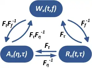 where the kernel function is defined in the time-frequency domain instead of the ambiguity one. In the original Wigner representation, . The relationship between the two kernels is the same as the one between the WD and the AF, namely two successive Fourier transforms (cf. diagram).
