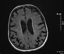 Binswanger's disease, also known as subcortical leukoencephalopathy and subcortical arteriosclerotic encephalopathy,[1] is a form of small-vessel vascular dementia caused by damage to the white brain matter.[2] White matter atrophy can be caused by many circumstances including chronic hypertension as well as old age.[3] This disease is characterized by loss of memory and intellectual function and by changes in mood. These changes encompass what are known as executive functions of the brain.[4] It usually presents between 54 and 66 years of age, and the first symptoms are usually mental deterioration or stroke.[5]